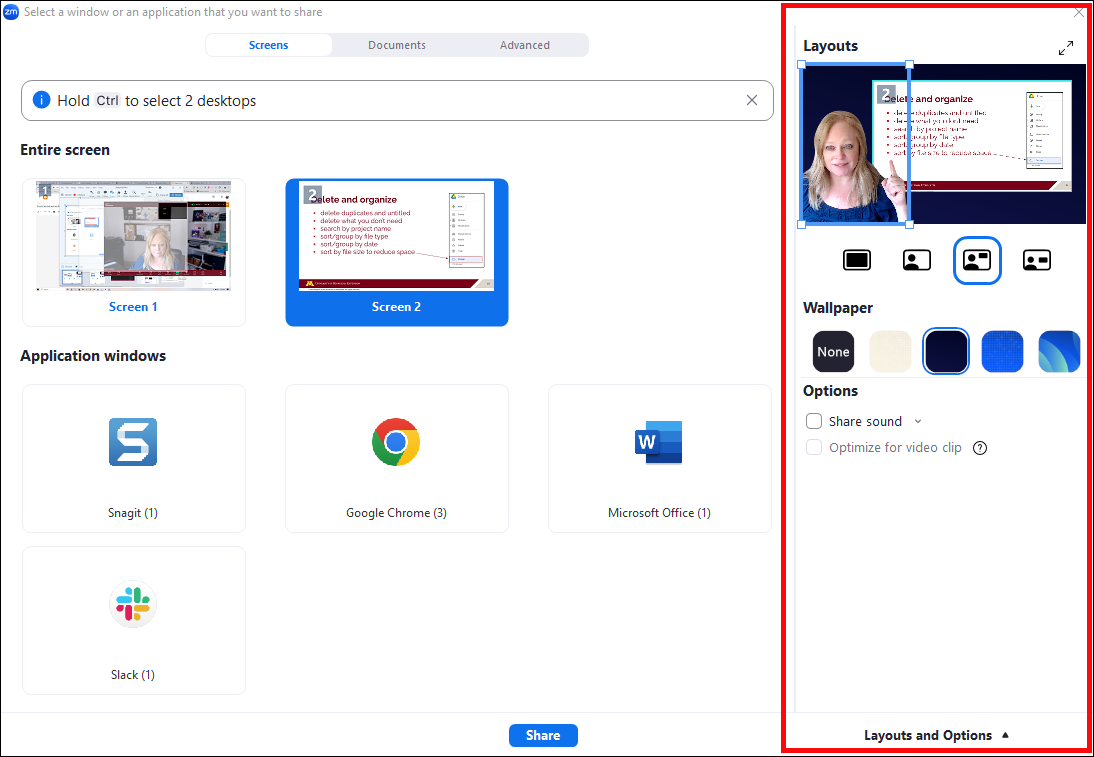 The screen sharing presenter layouts combine the presenter video and shared content in one frame. A few different layout options include having the content appear over the shoulder of your video, the presenter appearing in front of the content or the presenter and content appear side by side. Click Share Screen. At the bottom of the screen share selection window, click Layouts and Options to display or hide the right-side Layouts panel.